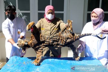 Dokter hewan Balai Konservasi Sumber Daya Alam (BKSDA) Aceh bersama mahasiswa Fakultas Kedokteran Hewan Universitas Syiah Kuala melakukan pengukuran saat forensik terbatas terhadap barang bukti kulit harimau sumatera (Panthera tigris sumatrae) hasil sitaan di Banda Aceh, Aceh, Rabu (1/12/2021). Forensik terbatas tersebut dilakukan untuk mengetahui jenis kelamin, usia dan melihat perubahan pada kulit serta perkiraan penyebab kematian harimau yang berusia sekitar satu tahun itu. ANTARA FOTO / Irwansyah Putra/aww.