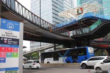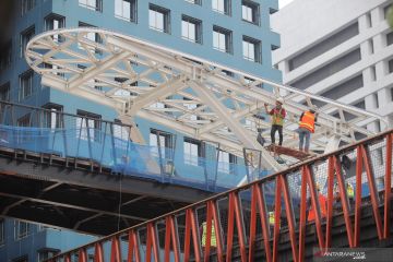 Pekerja menyelesaikan revitalisasi JPO Sudirman di Jalan Jenderal Sudirman, Jakarta, Jumat (3/12/2021). Pemprov DKI Jakarta merevitalisasi JPO Sudirman dengan konsep menyerupai kapal pinisi yang dilengkapi jalur sepeda dan terintegrasi dengan halte TransJakarta untuk mendukung program Jakarta ramah pejalan kaki. ANTARA FOTO/Reno Esnir/wsj.