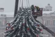 Pekerja membangun pohon Natal saat hujan salju lebat di Moskow, Rusia, Selasa (7/12/2021). ANTARA FOTO/REUTERS/Maxim Shemetov/rwa.