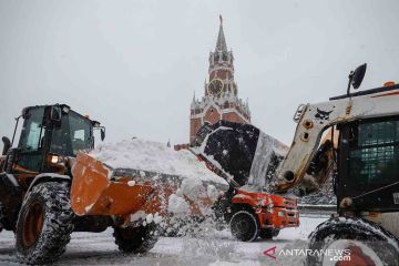 Pekerja mengoperasikan kendaraan pengangkut salju di Lapangan Merah saat hujan salju lebat di Moskow, Rusia, Selasa (7/12/2021). ANTARA FOTO/REUTERS/Maxim Shemetov/rwa.