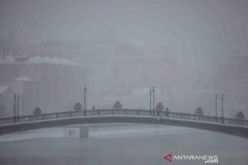 Orang-orang berada di jembatan saat hujan salju lebat di Moskow, Rusia, Selasa (7/12/2021). ANTARA FOTO/REUTERS/Maxim Shemetov/rwa.
