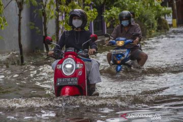 Pengendara motor menerobos banjir yang menggenangi Jalan Cemara di Banjarmasin, Kalimantan Selatan, Rabu (8/12/2021). Sejumlah daerah di Kalimantan Selatan terendam banjir dan pemerintahnya telah menetapkan status tanggap darurat bencana banjir, tanah longsor, angin puting beliung dan gelombang pasang dari 3 - 16 Desember 2021 akibat semakin meningkatnya curah hujan. ANTARA FOTO/Bayu Pratama S/wsj.
