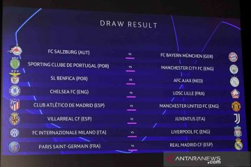 Hasil Undian Babak 16 Besar Liga Champions 2021/22 ditampilkan pada layar di markas UEFA, Nyon, Swiss, Senin (13/12/2021). Hasil pengundian awal dimana mempertemukan Manchester United dengan PSG dibatalkan dan dilakukan pengundian ulang menyusul terjadinya kesalahan teknis. ANTARA FOTO/UEFA/Handout via REUTERS/rwa.