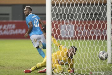 Pesepak bola Sulut United Patrich Wanggai (kiri) bereaksi usai membobol gawang PSMS Medan dalam pertandingan babak delapan besar Grup Y Liga 2 Indonesia di Stadion Wibawa Mukti, Cikarang, Kabupaten Bekasi, Jawa Barat, Kamis (16/12/2021). Pertandingan dimenangkan Sulut United dengan skor 2-1. ANTARA FOTO/Aditya Pradana Putra/foc.