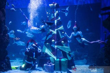 Penyelam berkostum Sinterklas dan putri duyung tampil dalam pertunjukan menghias pohon Natal bawah air di Jakarta Aquarium dan Safari, Jakarta, Senin (20/12/2021). Pertunjukan tersebut diselenggarakan untuk memeriahkan perayaan Natal 2021 dan Tahun Baru 2022. ANTARA FOTO/Dhemas Reviyanto/rwa.