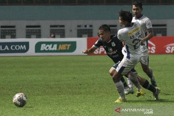 Pesepak bola PSIM Yogyakarta Iqmal N Samsu (kiri) berebut bola dengan pesepak bola PSMS Medan M Sabillah (kanan) pada pertandingan babak delapan besar Liga 2 di Stadion Wibawa Mukti, Cikarang, Kabupaten Bekasi, Jawa Barat, Senin (20/12/2021). Pertandingan berakhir dengan skor imbang 0-0. ANTARA FOTO/ Fakhri Hermansyah/aww.