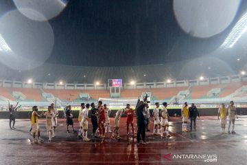 Sejumlah pesepak bola Martapura Dewa United melakukan selebrasi kemenangan setelah mengalahkan PSMS Medan dalam lanjutan Liga 2 babak 8 besar di Stadion Pakansari, Kabupaten Bogor, Jawa Barat, Kamis (23/12/2021). Martapura Dewa United menang dengan skor 1-0, dan berhak melaju ke babak semi final. ANTARA FOTO/Yulius Satria Wijaya/aww.