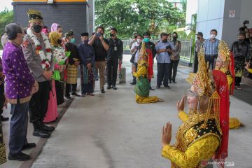 Kapolda Riau yang baru Irjen Pol Muhammad Iqbal (kiri) beserta istri disambut oleh Gubernur Riau Syamsuar (kanan) dan Majelis Ketua Harian LAM Riau Datuk Syahril Abu Bakar (tengah) saat tiba di Gedung VIP Lancang Kuning Bandar Udara Sultan Syarif Kasim II Pekanbaru, Riau, Sabtu (1/1/2022). Irjen Pol Muhammad Iqbal sebelumnya menjabat sebagai Kapolda NTB. ANTARA FOTO/Rony Muharrman/hp.