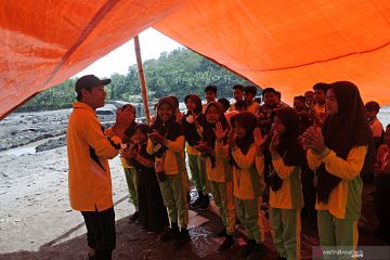 Siswa SDN Jugosari 3 belajar di tenda di pinggir Sungai Regoyo, Desa Jugosari, Candipuro, Lumajang, Jawa Timur, Jumat (7/1/2022). Banjir lahar Gunung Semeru telah memutus jembatan dan mengisolir siswa SDN Jugosari 3 sehingga sejumlah guru berinisiatif untuk melakukan kegiatan belajar mengajar di tenda darurat. ANTARA FOTO/Seno/foc.