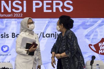 Kepala Badan Pengawas Obat dan Makanan (BPOM) Penny Lukito (kiri) berbincang dengan Ketua Indonesian Technical Advisory Group on Immunization (ITAGI) Sri Rezeki Hadinegoro (kanan) usai memberikan keterangan pers terkait vaksin COVID-19 booster atau vaksin lanjutan di Kantor BPOM, Jakarta, Senin (10/1/2022). BPOM resmi menerbitkan izin penggunaan darurat atau Emergency Use Authorization (EUA) untuk lima vaksin COVID-19 yang akan digunakan sebagai vaksin dosis ketiga atau booster di Indonesia yang program vaksinasinya akan dimulai pada 12 Januari 2022. ANTARA FOTO/Galih Pradipta/hp.