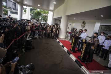 Jaksa Agung ST Burhanuddin (kanan depan) melakukan salam komando saat menerima kedatangan Menteri BUMN Erick Thohir (kiri depan) di Gedung Menara Kartika Adhyaksa, Komplek Perkantoran Kejaksaan Agung, Jakarta, Selasa (11/1/2022). Kedatangan Menteri BUMN Erick Thohir tersebut untuk melaporkan beberapa kasus terkait maskapai Garuda Indonesia. ANTARA FOTO/Aprillio Akbar/wsj.