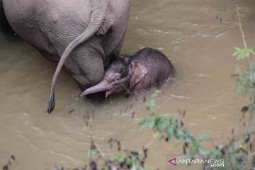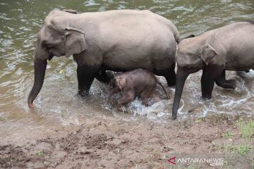 Seekor bayi gajah Asia liar bersama induknya di Lembah Gajah Liar, cagar alam nasional Xishuangbanna, Provinsi Yunnan, China barat daya, Sabtu (15/1/2022). Enam ekor bayi gajah Asia liar lahir berturut-turut di Lembah Gajah Liar, Provinsi Yunnan, China barat daya dan menunjukkan peningkatan populasi hewan yang terancam punah itu di China. ANTARA FOTO/Xinhua/Li Yunsheng/rwa.
