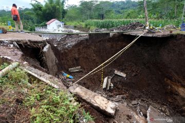 Warga menyaksikan jembatan ambruk di wilayah Mlondang Gandon, Kaloran, Temanggung, Jawa Tengah, Rabu (19/1/2022). Hujan lebat memicu tanah longsor dan mengakibatkan jembatan Mlondang yang menghubungkan sejumlah desa itu ambruk sehingga akses ekonomi dan pendidikan terganggu. ANTARA FOTO/Anis Efizudin/foc.