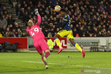 Pesepak bola Manchester United Anthony Elanga (kanan) mencetak gol ke gawang Brentford yang dijaga penjaga gawang Jonas Loessl dalam laga lanjutan Liga Inggris, di Stadion Brentford Community, London, Inggris, Rabu (19/1/2022). Manchester United berhasil mengalahkan Brentford 3-1. ANTARA FOTO/Reuters-Ian Walton /hp.