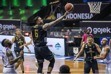 Pebasket DNA Bima Perkasa Jogja David Tanner Atkinson (ketiga kiri) melakukan lay up saat pertandingan Seri 2 Bandung Indonesian Basketball League (IBL) 2022 di Gor C-Tra Arena, Bandung, Jawa Barat, Selasa (1/2/2022). ANTARA FOTO/M Agung Rajasa/foc.