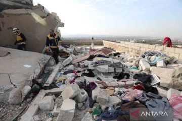 Sejumlah personel penolong melakukan pencarian di antara puing-puing bangunan di lokasi misi kontra-terorisme yang dipimpin Amerika Serikat di Atmeh, Suriah, Kamis (3/2/2022). Pentagon mengklaim Pasukan khusus Amerika Serikat dari US Special Operation Force (SOF) berhasil melakukan misi kontra-terorisme di lokasi tersebut yang menewaskan Pemimpin ISIS Abu Ibrahim al-Hashemi al-Qurayshi. ANTARA FOTO/Mohamed Al-Daher/Handout via REUTERS/wsj.