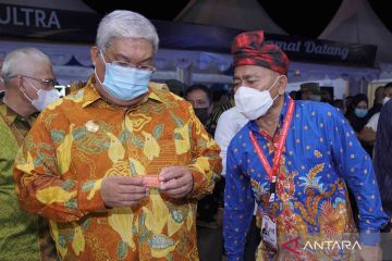 Gubernur Sulawesi Tenggara Ali Mazi (kiri) dan Ketua Umum PWI Pusat H. Atal S Depari (kanan) berkunjung ke salah satu stand UMKM di lokasi pameran peringatan Hari Pers Nasional (HPN) Tahun 2022 di areal MTQ Square, Kendari, Sulawesi Tenggara, Minggu (6/2/2022). Peringatan Hari Pers Nasional 2022 di Kendari akan melaksanakan berbagai kegiatan untuk pengembangan media serta wartawan dalam mendukung program pemerintah. ANTARA FOTO/Jojon/wsj.