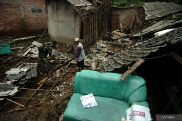 Personel TNI bersama warga membersihkan puing-puing rumah warga yang hancur akibat bencana tanah bergerak di Desa Dermasuci, Kabupaten Tegal, Jawa Tengah, Minggu (13/2/2022). Menurut PMI Kabupaten Tegal, sebanyak 97 rumah rusak ringan dan berat akibat bencana tanah bergerak dalam sepekan terakhir di daerah tersebut sehingga mengakibatkan sekitar 200 warga terpaksa mengungsi. ANTARA FOTO/Oky Lukmansyah/hp.