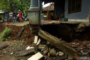 Warga memperhatikan lantai rumah yang amblas akibat bencana tanah bergerak di Desa Dermasuci, Kabupaten Tegal, Jawa Tengah, Minggu (13/2/2022). Menurut PMI Kabupaten Tegal, sebanyak 97 rumah rusak ringan dan berat akibat bencana tanah bergerak dalam sepekan terakhir di daerah tersebut sehingga mengakibatkan sekitar 200 warga terpaksa mengungsi. ANTARA FOTO/Oky Lukmansyah/hp.
