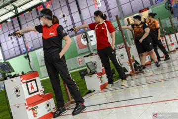 Sejumlah petembak membidik sasaran saat mengikuti final 25 meter Pistol Women dalam ajang ISSF Grand Prix Rifle/Pistol di Lapangan Tembak Senayan, Jakarta, Senin (14/2/2022). Petembak Singapura Shun Xie Theo meraih medali emas disusul petembak Indonesia Talitha Judith Almira dengan medali perak dan medali perunggu diraih petembak Thailand Natsara Champalat. ANTARA FOTO/M Risyal Hidayat/hp.