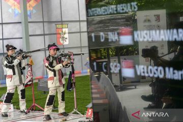 Petembak Indonesia Diaz Kusumawardani (kanan) berdampingan dengan petembak Singapura Martina Lindsay Veloso mengikuti Final 50 meter Rifle 3 Positions Women dalam ajang ISSF Grand Prix Rifle/Pistol di Lapangan Tembak Senayan, Jakarta, Selasa (15/2/2022). Petembak Singapura Martina Lindsay Veloso meraih medali emas disusul petembak Indonesia Diaz Kusumawardani dengan medali perak dan medali perunggu diraih petembak Thailand Suparmas Wankaew. ANTARA FOTO/M Risyal Hidayat/wsj.