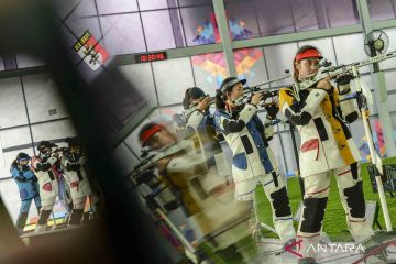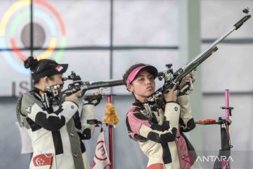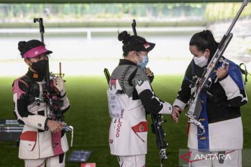Sejumlah petembak membidik sasaran saat mengikuti Final 50 meter Rifle 3 Positions Women dalam ajang ISSF Grand Prix Rifle/Pistol di Lapangan Tembak Senayan, Jakarta, Selasa (15/2/2022). Petembak Singapura Martina Lindsay Veloso meraih medali emas disusul petembak Indonesia Diaz Kusumawardani dengan medali perak dan medali perunggu diraih petembak Thailand Suparmas Wankaew. ANTARA FOTO/M Risyal Hidayat/wsj.