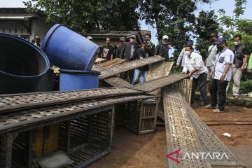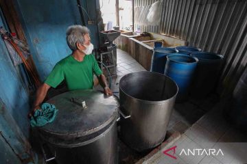 Perajin tempe menata alat untuk merebus kedelai di tempat usahanya di Kampung Tempe Tenggilis Kauman, Surabaya, Jawa Timur, Senin (21/2/2022). Para pelaku usaha pembuatan tempe di kampung tersebut melakukan aksi mogok memproduksi tempe selama tiga hari kedepan sebagai bentuk protes melonjaknya harga kedelai. ANTARA FOTO/Didik Suhartono/rwa.
