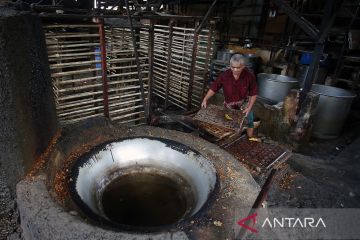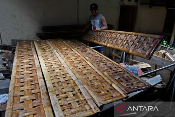 Pekerja menata alas bambu untuk tempe di sentra industri tahu dan tempe Kampung Rawa, Johar Baru, Jakarta, Senin (21/2/2022). Ratusan pelaku industri setempat mengikuti aksi mogok produksi serentak yang dipicu melambungnya harga kedelai impor (bahan baku tahu tempe) dari harga normal Rp9.500-10.000 per kilogram menjadi Rp12.000 per kilogram. ANTARA FOTO/Aditya Pradana Putra/rwa.