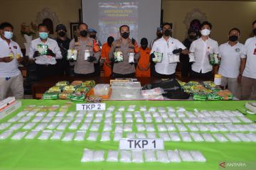 Polisi menunjukkan barang bukti narkotika jenis sabu saat konferensi pers di Polresta Denpasar, Bali, Selasa (22/2/2022). Satuan Reserse Narkoba Polresta Denpasar mengungkap kasus peredaran narkoba jaringan nasional dengan barang bukti 18,3 kilogram sabu dan 984 butir ekstasi yang diduga akan diedarkan tersangka berinisial AR dan MA di wilayah Bali dan sekitarnya. ANTARA FOTO/Fikri Yusuf/foc.