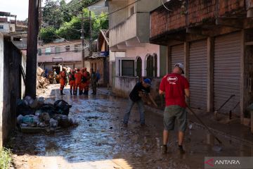 Petugas pemadam kebakaran setempat membersihkan endapan lumpur pasca banjir bandang dari jalan di Petropolis, Negara Bagian Rio de Janeiro, Brasil, Selasa (22/2/2022). Banjir bandang dan longsor akibat curah hujan dengan rekor tertinggi di kota sebelah utara Rio de Janeiro itu merenggut korban jiwa sebanyak 185 orang. ANTARA FOTO/Xinhua/Wang Tiancong/foc.