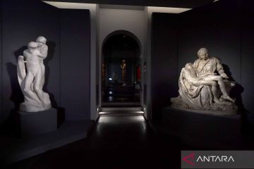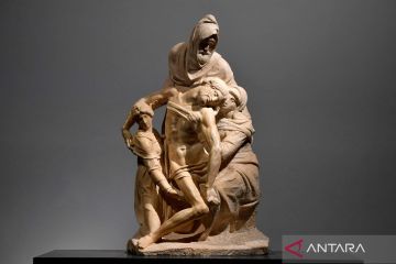 Patung seniman Michelangelo yang dikenal sebagai Vatican Pieta dipajang di Museum Opera del Duomo di sebelah versi lainnya di Florence, Italia, Rabu (23/2/2022). ANTARA FOTO/REUTERS/Jennifer Lorenzini/wsj.