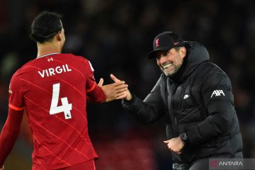 Pelatih Liverpool Juergen Klopp (kanan) melakukan selebrasi dengan menyalami pemainnya Virgil van Dijk setelah pertandingan usai saat melawan Leeds United dalam laga lanjutan Liga Inggris, di Stadion Anfield, Liverpool, Inggris, Rabu (23/2/2022). Liverpool membantai Leeds United 6-0 dan Mohamed Salah menyumbang dua gol dalam pertandingan ini. ANTARA FOTO/Reuters--Peter Powell/hp.