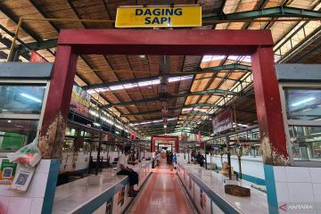 Seorang pedagang daging sapi berada di los khusus penjualan daging sapi di Pasar Modern BSD, Serpong, Tangerang Selatan, Banten, Selasa (1/3/2022). Mogok dagang yang dilakukan para penjual daging sapi se Jabodetabek kali ini merupakan mogok dagang yang terlama hingga 5 hari yang biasanya hanya 3 hari karena tingginya harga daging yang mencapai hingga Rp140 ribu per kilogramnya. ANTARA FOTO/Muhammad Iqbal/foc.