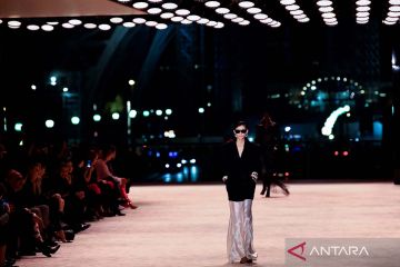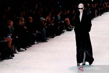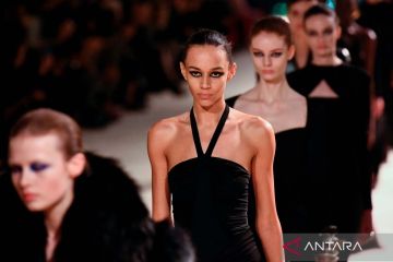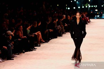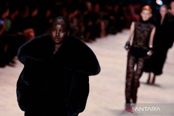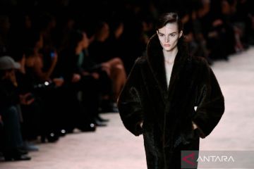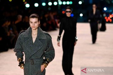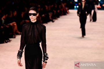 Peragawati memperagakan kreasi baju dan aksesoris karya perancang busana Anthony Vaccarello sebagai bagian dari koleksi busana wanita siap pakai Musim Gugur-Musim Dingin 2022/2023 untuk rumah mode Saint Laurent saat Paris Fashion Week di Paris, Prancis, Selasa (1/3/2022). ANTARA FOTO/REUTERS/Piroschka van de Wouw/wsj.
