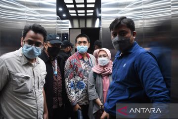 (kiri ke kanan) Para mantan pegawai KPK Farid Andhika, Novel Baswedan, Yudi Purnomo, Ita Khoiriyah dan Aulia Posteria berad di dalam lift seusai menghadiri sidang perdana gugatan dengan agenda pemeriksaan persiapan di PTUN Jakarta, Kamis (10/3/2022). Sebanyak 49 mantan pegawai KPK yang diberhentikan melalui tes wawasan kebangsaan (TWK) mengajukan gugatan yang ditujukan kepada Presiden RI, pimpinan KPK, dan Kepala BKN dengan objek gugatan perbuatan melawan hukum atas tidak dilaksanakannya rekomendasi Komnas HAM tertanggal 16 Agustus 2021 dan rekomendasi Ombudsman RI tertanggal 15 September 2021. ANTARA FOTO/Sigid Kurniawan/rwa.