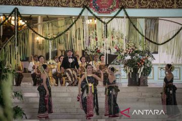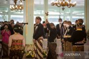 GPH Bhre Cakrahutomo Wira Sudjiwo duduk di kursi Paringitan melihat penampilan tari Bedhaya Anglir Mendhung pada acara Jumenengan Mangkunagoro X di Pura Mangkunegaran, Solo, Jawa Tengah, Sabtu (12/3/2022). Pura Mangkunegaran menggelar Jumenengan atau upacara kenaikan takhta GPH Bhre Cakrahutomo Wira Sudjiwo sebagai KGPAA Mangkunagoro X dan mengundang sejumlah tamu undangan diantaranya dari Keraton Kasunanan Solo, Keraton Kasultanan Yogyakarta dan Pura Pakualaman Yogyakarta. ANTARA FOTO/Mohammad Ayudha/rwa.