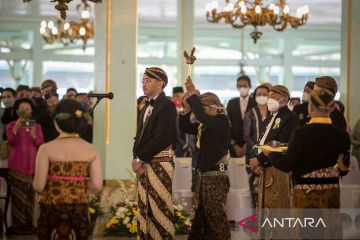 Abdi Pura Mangkunegaran mengganti keris GPH Bhre Cakrahutomo Wira Sudjiwo (keempat kanan) saat acara Jumenengan Mangkunagoro X di Pura Mangkunegaran, Solo, Jawa Tengah, Sabtu (12/3/2022). Pura Mangkunegaran menggelar Jumenengan atau upacara kenaikan takhta GPH Bhre Cakrahutomo Wira Sudjiwo sebagai KGPAA Mangkunagoro X dan mengundang sejumlah tamu undangan diantaranya dari Keraton Kasunanan Solo, Keraton Kasultanan Yogyakarta dan Pura Pakualaman Yogyakarta. ANTARA FOTO/Mohammad Ayudha/rwa.
