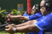 Menteri Hukum dan HAM Yasonna Laoly (kanan) membidik sasaran saat mengikuti Lomba Menembak Piala Komandan Pasukan Pengamanan Presiden (Danpaspampres) 2022 dalam kelas 'Dueling Plate' di Lapangan Tembak Senayan, Jakarta, Minggu (13/3/2022). Kejuaraan menembak yang merupakan rangkaian Hari Bakti ke-76 Paspampres tersebut diikuti sekitar 800 peserta dari TNI/Polri dan sipil. ANTARA FOTO/M Risyal Hidayat/foc.