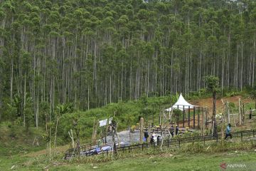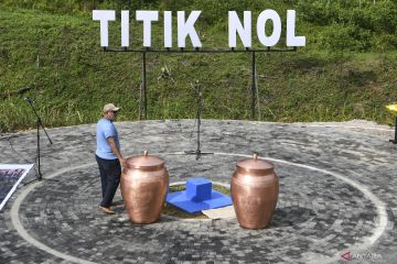 Pekerja menyelesaikan pekerjaan persiapan jelang seremoni ritual Kendi Nusantara di titik nol Ibu Kota Negara (IKN) Nusantara di Kecamatan Sepaku, Penajam Paser Utara, Kalimantan Timur, Minggu (13/3/2022). Presiden Joko Widodo akan menggelar seremoni ritual Kendi Nusantara dengan mengumpulkan 34 tanah dan air yang dibawa oleh 34 gubernur se-Indonesia di titik nol IKN Nusantara pada Senin (14/3/2022). ANTARA FOTO/Hafidz Mubarak A/hp.
