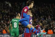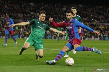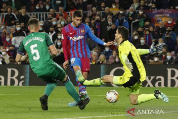 Pesepak bola Barcelona Riqui Puig melakukan selebrasi dengan rekannya Gavi setelah mencetak gol ke gawang Osasuna dalam laga lanjutan Liga Spanyol, di Stadion Camp Nou, Barcelona, Spanyol, Minggu (13/3/2022). Barcelona berhasil mengalahkan Osasuna 4-0. ANTARA FOTO/Reuters- Albert Gea/hp.