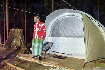 Presiden Joko Widodo berada di depan tenda saat bermalam di titik nol Ibu Kota Negara (IKN) Nusantara, Kecamatan Sepaku, Penajam Paser Utara, Kalimantan Timur, Senin (14/3/2022). Presiden bersama sejumlah menteri dan lima gubernur di Pulau Kalimantan bermalam di lokasi titik nol IKN Nusantara. ANTARA FOTO/HO/Setpres-Agus Suparto/foc.