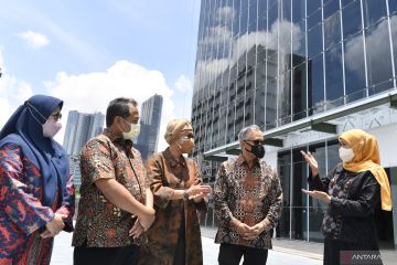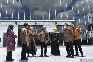 Ketua Dewan Komisioner Otoritas Jasa Keuangan (OJK) Wimboh Santoso (kiri) berbincang dengan Gubernur Jawa Timur Khofifah Indar Parawansa (ketiga kanan) dan anggota DPR Komisi XI Indah Kurnia (kanan) serta sejumlah pejabat OJK ketika meninjau Kantor OJK Regional IV Jawa Timur usai peresmian kantor tersebut di Surabaya, Jawa Timur, Selasa (15/3/2022). Dengan hadirnya Kantor OJK tersebut diharapkan dapat memperkuat peran OJK di sektor jasa keuangan yang memberikan perlindungan terhadap konsumen serta mendukung pengembangan perekonomian di daerah itu. ANTARA FOTO/Zabur Karuru/hp.