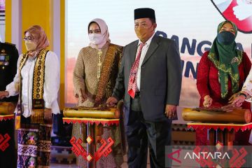 Gubernur Lampung Arinal Djunaidi (kedua kanan) didampingi Direktur Jenderal Industri Kecil Menengah dan Aneka Kementerian Perindustrian Reni Yanita (kiri), Istri Gubernur Lampung sekaligus Ketua TP PKK Provinsi Lampung Riana Sari Arinal (kedua kiri), dan Wakil Gubernur Lampung Chusnunia Chalim (kanan) memukul alat musik tradisional pada acara "kick off" Gerakan Nasional Bangga Buatan Indonesia (Gernas BBI) Lagawi Fest Tahun 2022 di Mahan Agung, Bandar Lampung, Lampung, Kamis (17/3/2022). Gernas BBI tersebut membidik peningkatan penjualan secara online bagi 30 industri kecil dan menengah terpilih selama tiga bulan. ANTARA FOTO/Rivan Awal Lingga/pras.