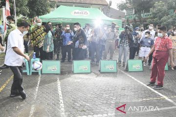 Kepala Staf Kepresidenan Republik Indonesia Moeldoko (kiri) bermain sepak bola dengan pelajar usai meninjau vaksinasi COVID-19 di SDN Jatiasih IV, Bekasi, Jawa Barat, Kamis (17/3/2022). ANTARA FOTO/ Fakhri Hermansyah/pras.