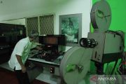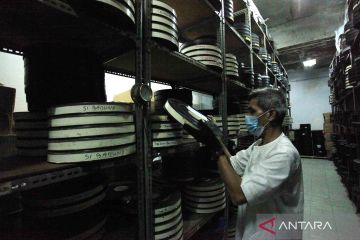 Petugas perawatan film Sinematek, Firdaus melakukan perawatan gulungan pita film atau seluloid di salah satu ruang bawah tanah gedung Pusat Perfilman Haji Usmar Ismail (PPHUI), Jalan HR Rasuna Said, Jakarta, Rabu (30/3/2022). Hari Film Nasional yang dirayakan setiap tanggal 30 Maret, penetapan tanggalnya berdasarkan pada sejarah pertama kali pengambilan gambar film besutan mendiang tokoh perfilman nasional H. Usmar Ismail. ANTARA FOTO/Reno Esnir/wsj.
