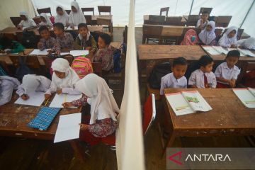 Sejumlah siswa mengikuti kegiatan belajar mengajar tatap muka di dalam tenda darurat di SDN 21 Kecamatan Pasaman, Nagari Aua Kuniang, Kabupaten Pasaman Barat, Sumatera Barat, Kamis (7/4/2022). Proses belajar mengajar (PBM) tingkat SD dan SMP di kabupaten yang terdampak gempa magnitudo 6,1 pada Februari lalu itu kini kembali dibuka selama Ramadhan, namun sebagian siswa terpaksa belajar di bawah tenda darurat karena bangunan sekolah mereka rusak. ANTARA FOTO/Iggoy el Fitra/rwa.