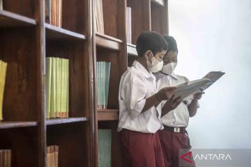 Dua orang murid membaca buku pelajaran di SDN 01 Malasari, Nanggung, Bogor, Jawa Barat, Sabtu (9/4/2022). Berdasarkan data dari UNESCO, minat baca siswa di Indonesia hanya 0,001 persen, di mana hal tersebut disebabkan tidak ada motivasi membaca serta kurangnya sarana prasarana untuk membaca. ANTARA FOTO/Muhammad Adimaja/wsj.