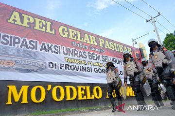 Sejumlah anggota kepolisian mengikuti Apel Gelar Pasukan di halaman Polda Gorontalo, Gorontalo, MInggu (10/4/2022). Apel tersebut dalam rangka antisipasi aksi unjuk rasa (unras) Badan Eksekutif Mahasiswa (BEM) Seluruh Indonesia (SI) yang rencananya akan digelar pada Senin (11/4). ANTARA FOTO/Adiwinata Solihin/aww.