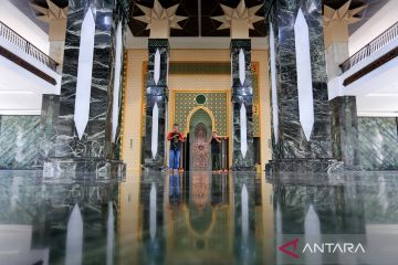 Sejumlah pengunjung melihat suasana di dalam Masjid Giok atau Masjid Agung Baitul A'la Desa Lueng Baro, Suka Makmur, Nagan Raya, Aceh, Minggu (10/4/2022). Masjid Agung Baitul A'la Nagan Raya yang dibangun sejak tahun 2012 tersebut dirancang menggunakan perpaduan arsitektur khas Asia Tenggara, Timur Tengah dan Aceh dengan ornamen berlapis batu giok pada lantai, dinding, tiang dan kubah masjid yang proses pembangunannya memasuki tahap penyelesaian atau sekitar 80 persen sehingga akan dibuka untuk umum pada Juni 2022. ANTARA FOTO/Syifa Yulinnas/aww.