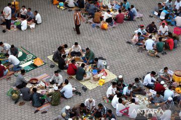 Warga menyiapkan makanan untuk berbuka puasa pada tradisi kenduri Ramadhan di Banda Aceh, Aceh, Minggu (10/4/2022). Kenduri yang dirayakan dengan cara berbuka puasa bersama di halaman masjid tersebut telah menjadi tradisi pada setiap bulan Ramadhan. ANTARA FOTO / Irwansyah Putra/aww.